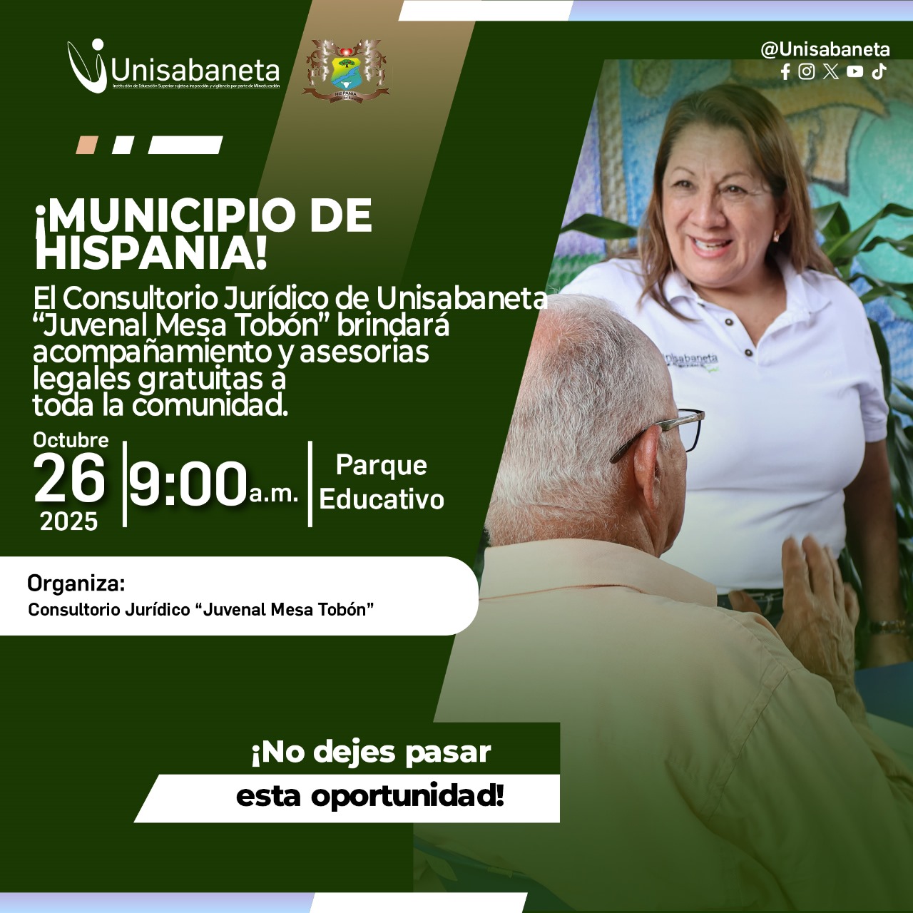 Comprometido con la solución de problemáticas sociales y jurídicas que afectan a las comunidades, el Consultorio Jurídico “Juvenal Mesa Tobón” de la Corporación Universitaria de Sabaneta – Unisabaneta realizará una importante jornada de asesoría jurídica gratuita los días 25 y 26 de octubre de 2025 en el Suroeste Antioqueño. En esta ocasión, los municipios de … Leer más